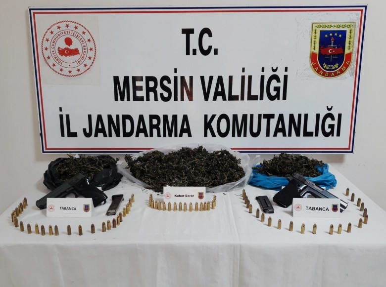 İl Jandarma Komutanlığından yapılan açıklamaya göre, ekiplerin uyuşturucu madde imal ve ticaretini yapan şahıslara yönelik yaptığı araştırmalarda Erdemli Akpınar Mahallesi ile Tarsus Konaklar Mahallesi'nde 2 şahsın uyuşturucu imal ve satışı yaptığı tespit edildi. Bunun üzerine belirlenen adreslere operasyon yapan ekipler, 2 kişiyi gözaltına alırken, adreslerinde yapılan aramalarda 2 kilo 500 gram kurumaya bırakılmış kenevir, 40 gram kenevir tohumu, bir kilo 175 gram kubar esrar, 2 ruhsatsız tabanca, 3 şarjör, 76 adet tabanca fişeği ile 1 uyuşturucu madde kullanma aparatı ele geçirildi.