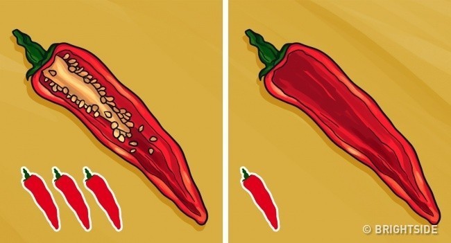 - Sadece tohumları ve damarları çıkarın ve soğuk suyla durulayın. Acılık kaybolacak, fakat tadı değişmeyecek.