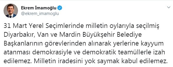 İBB Başkanı Ekrem İmamoğlu, Diyarbakır, Van ve Mardin'de HDP'li belediye başkanlarının görevden alınmalarıyla ilgili Twitter'dan bir açıklama yaptı.