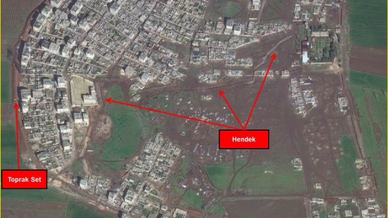 Terör örgütü YPG/PKK-DEAŞ' ın, kara harekatına karşılık olarak, ilçenin dört bir tarafını hendek ve toprak setlerle çevirdiği öğrenildi.