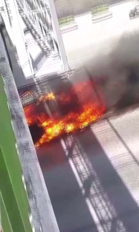 Otomobilin alev alev yandığı anlar kameraya yansıdı.