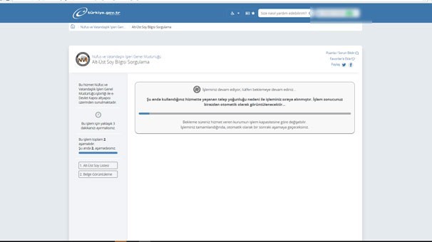 Alt-üst soy bilgisi sorgulama’ sistemine girenler “Şu anda kullandığınız hizmette yaşanan talep yoğunluğu nedeni ile işleminiz sıraya alınmıştır. İşlem sonucunuz birazdan otomatik olarak görüntülenecektir” uyarısıyla karşılaşıyor.