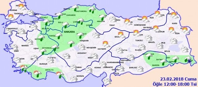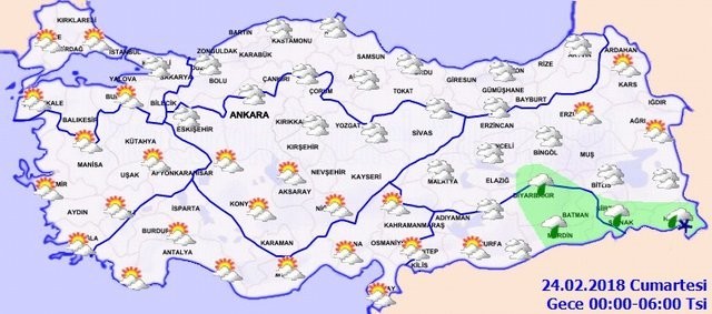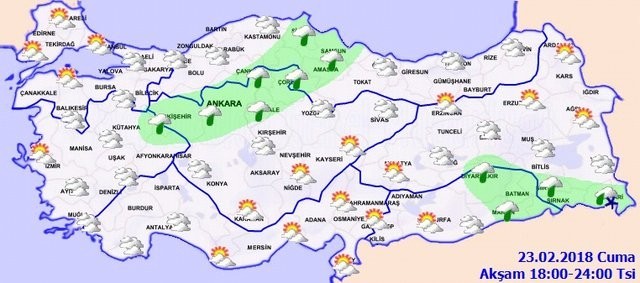 Marmara'nın güney ve doğusu, Ege, Batı Akdeniz, İç Anadolu'nun kuzeybatısı, Batı Karadeniz ve Güneydoğu Anadolu'nun doğusu ile Muğla, Çorum, Amasya, Samsun, Şırnak ve Hakkari çevrelerinin yağışlı geçeceği tahmin ediliyor. Yağışların; genellikle hafif yağmur ve sağanak, Hakkari çevrelerinde yer yer karla karışık yağmur ve kar şeklinde olması bekleniyor.