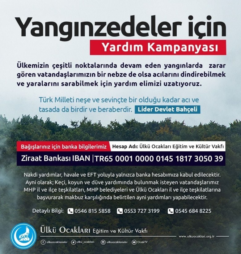 MHP il, ilçe teşkilatları ve belediyelerinden hayvanları telef olan ailelere 5 keçi 5 koyun ve 2 düve yardımı yapılması amacıyla kampanya başlatıldığını ifade eden Alıcık; “Gazi Mustafa Kemal Atatürk'ün "Ormansız bir yurt vatan değildir" sözü Türk Milletimizin ormanlarımıza bakışının özetidir. Neşe ve sevinçte bir olduğu kadar acı ve tasada da birdir ve beraberliktir en büyük gücümüz. Böylesi afet dönemlerinde milli birlik ve yardımlaşma duygumuzun canlı tutulması, hemşerilik gücümüz, aklıselim ve kalbi selim bir tutumumuzla felakete direnç göstermemiz çok önemlidir. Yangından zarar gören hemşerilerimizin yanında madden ve manen yerimizi alacak, gücümüz ve imkanlarımız nispetinde yardım elimizi uzatacağız. Dava arkadaşlarımızdan, il ve ilçe teşkilatlarımızla birlikte, belediyelerimiz ihtiyaç sahibi vatandaşlarımıza ulaşacak, gerekli çalışmayı yapacaktır. Yangın söndürme çalışmalarına Ülkü Ocaklarımız büyük destek vermiş ve vermeye devam etmektedir. Teşkilatlarımız ihtiyaç duyulan malzemelerin temini için gayret sarf etmektedir. Genel Başkanımız Sayın Dr. Devlet Bahçeli’nin talimatlarıyla; hayvanları yangında telef olan köylülerin acısını hafifletmek ve bütçelerine katkı sağlamak maksadıyla MHP il-ilçe teşkilatları ve belediyelerinden hayvanları telef olan ailelere 5 keçi 5 koyun ve 2 düve yardımı yapılması maksadıyla kampanya başlatmıştır” dedi.