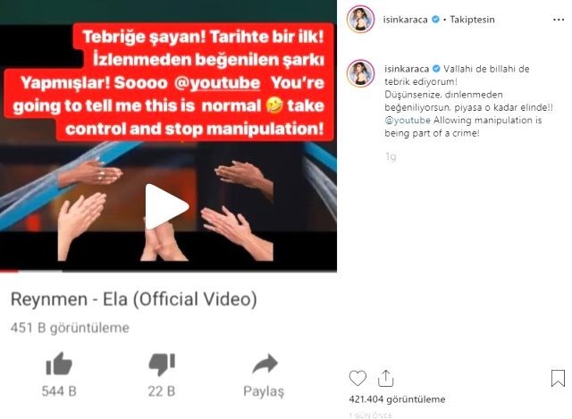Işın Karaca, Reynmen'in klibinin izlenme oranını Instagram hesabından paylaşarak "Düşünsenize dinlenmeden beğeniliyorsun, piyasa o kadar elinde" dedi.