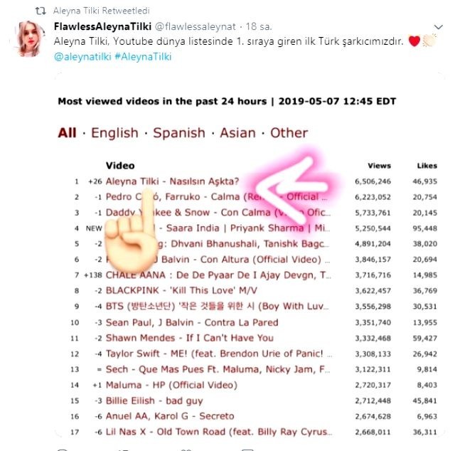 Instagram hesabından video paylaşan Reynmen, dünya müzik listesinin bir numarasına oturan ilk Türk kendisinin olduğunu söyledi.Ardından Aleyna Tilki, Nasılsın Aşkta şarkısının dünya müzik listesinin birinci sırasında olduğunu gösteren bir tweeti kendi sayfasında yayınlayarak "Çomar Show" ve "Derine inme çıkamazsın" ifadelerini kullandı.